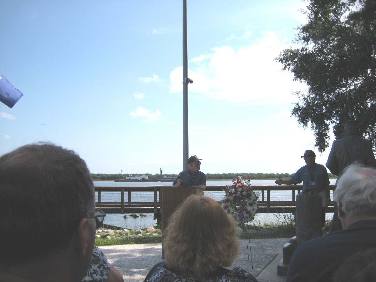 Day 4: We all boarded a bus for the former Charleston Navy Yard to visit the raised confederate submarine Hunley. The sub was raised in 2000 after having been submerged for over a century. The Hunley is housed in its 90,000 gallon conservation tank. Artifacts found during excavation of the submarine are also displayed. After visiting the Hunley, we then went to the Lone Sailor Memorial for a Memorial Service for those shipmates known to us who were no longer with us. That afternoon we had our Business Meeting where reports were given, we then discussed where and where and when our next reunion would be held, officers were elected and the meeting adjourned. In the evening we attended our Ships Banquet where we honored our three Plank Owners, Richard Sandlin, QMC retired, Richard Hopper, BTC retired and Robert Warwick MM2. A special presentation was given to David and Rhonda Dortch for their effort in putting this reunion together. Our guest speaker was Mike Lussier, curator of the American Military Museum in Charleston. He spoke about and showed a WWI Navy uniform and also showed a Navy enlisted flat hat. He had some other military coats and memorabilia from their museum. He also described some of the battle at Pearl Harbor and the Omaha Beach landing by Allied Forces on D-Day.